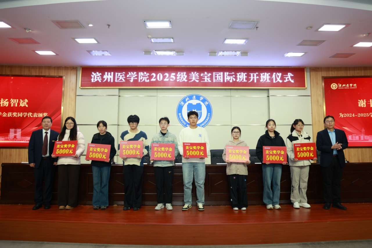 18日下午,孙祥军在办公楼十楼接待室会见杨智斌一行,代表学校对美宝集团杨智斌一行表示欢迎。他介绍了学校近年来发展成效,对美宝集团与学校广泛开展合作以及共同加强科学研究和人才培养表示赞赏;希望学校与美宝集团进一步加强交流、深化合作,共同提升美宝国际班学生培养质量,探索企业出题、学校“揭榜挂帅”的产学研深度融合新范式,共同为医学教育事业和生命健康产业发展做出新的贡献。杨智斌代表美宝集团对学校的高度重视和所做工作表示感谢,对学校的蓬勃发展给予高度评价;介绍了美宝集团在产业发展布局、践行社会责任等方面所做出的积极工作,表示将持续深化互访交流推动各项合作内容取得新成效,共同促进校企合作共赢发展。 会见后,举行2025级美宝国际班开班仪式。谢书阳寄语2025级美宝班新生,要扎实掌握专业知识,积极培养创新思维,成就自己的人生理想。他强调,各教学职能部门及相关学院要高度重视美宝国际班的人才培养工作,持续深化产教融合的教育教学模式探索,助力美宝国际班本科教育实现持续创新发展。美宝集团(中国)副总裁商庆新介绍了美宝集团的发展历程和发展成效,并表示美宝集团将继续深化与滨医合作,为学生提供更多国内外学习机会,共同提升人才培养质量;并勉励同学们传承奋斗创新精神,争做卓越医学人才。8位美宝奖学金获奖同学代表接受颁奖,美宝奖学金获得者代表王涵、赴美访学学生代表孔浩然、新生代表龙永浩分别发言。美宝国际班学业导师徐飞博副教授发言并带领美宝班全体新生诵读医学生誓言。