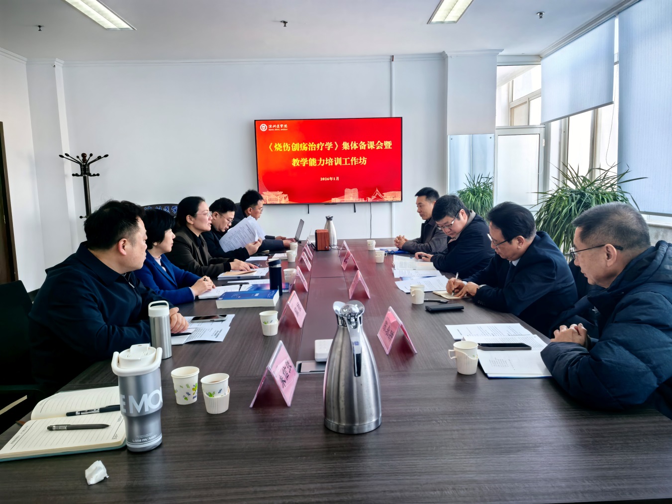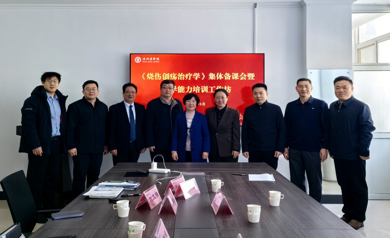 会见现场 会见后,上午举行《烧伤创疡治疗学》集体备课会。滨州医学院教务处副处长、第一临床医学院副院长张晓敏主持会议,她对校外4位专家教授莅临学校参加集体备课与教学技能培训表示欢迎和感谢,简要介绍了我校临床医学专业美宝国际班的办学特点、人才培养方案和特色课程群情况,将进一步提升任课教师与教学管理人员对课程建设与教学质量的重视程度。课程负责人刘文明带领参会人员深入研讨课程教学大纲与教学计划,并逐一达成共识。徐荣祥再生医学研究中心联席主任刘于嫣介绍相关教学规范,强调任课教师要更新教育教学理念,以学生发展为中心,丰富教学内容,改革教学方法与手段,加强智能化辅助教学,关注学生三维学习目标达成度。彭浩主任针对打造具有校企合作特色的精品课程提出了相关建议。