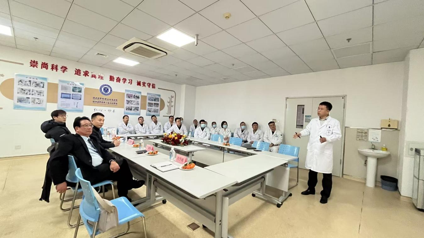 徐荣祥再生医学研究中心年度工作交流会 23日上午,特邀美宝集团医疗专家丁明华、王洪生赴我校烟台附属医院创伤骨科(创面修复科)进行交流指导,医院院长范万峰、副院长贾树山参加活动。两位专家与医院领导就创面修复科学科建设和业务发展交换意见;王洪生主任就糖尿病足的诊疗规范向医院多学科医护人员进行专题讲座。两位专家深入走访科室,听取科室主任安小春关于创面修复学科建设汇报,并应邀为糖尿病足住院患者进行床旁会诊与诊疗技术指导。丁明华主任对医院创面修复学科的建设与发展提出了一系列指导意见。